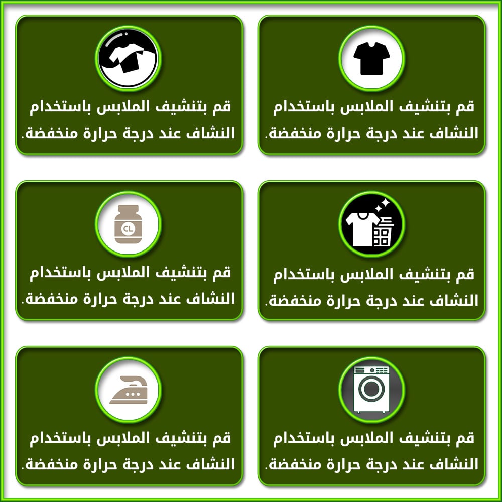 - قم بتنشيف الملابس بواسطة النشاف في درجة حرارة منخفضة